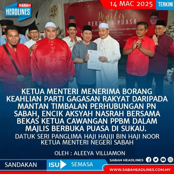 Reading:Ketua Menteri Menerima Borang Keahlian Parti Gagasan Rakyat Daripada Mantan Timbalan Perhubungan PN Sabah, Encik Aksyah Nasrah Bersama Bekas Ketua Cawangan PPBM Dalam Majlis Berbuka Puasa Di Sukau.